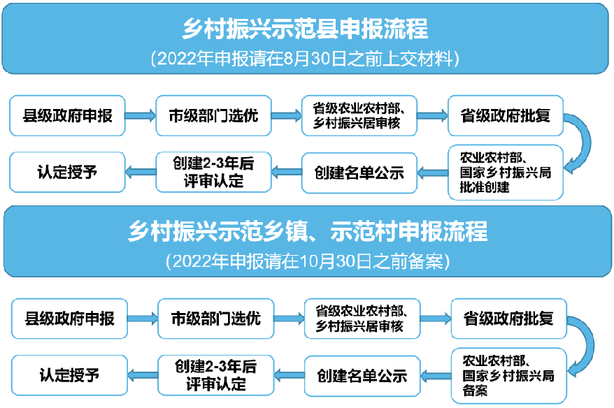 2022年7月20日,農(nóng)業(yè)農(nóng)村部、國家鄉(xiāng)村振興局印發(fā)《關(guān)于開展2022年“百縣千鄉(xiāng)萬村”鄉(xiāng)村振興示范創(chuàng)建的通知》,明確將分級(jí)組織創(chuàng)建100個(gè)左右國家鄉(xiāng)村振興示范縣,1000個(gè)左右鄉(xiāng)村振興示范鄉(xiāng)鎮(zhèn)、10000個(gè)左右鄉(xiāng)村振興示范村。